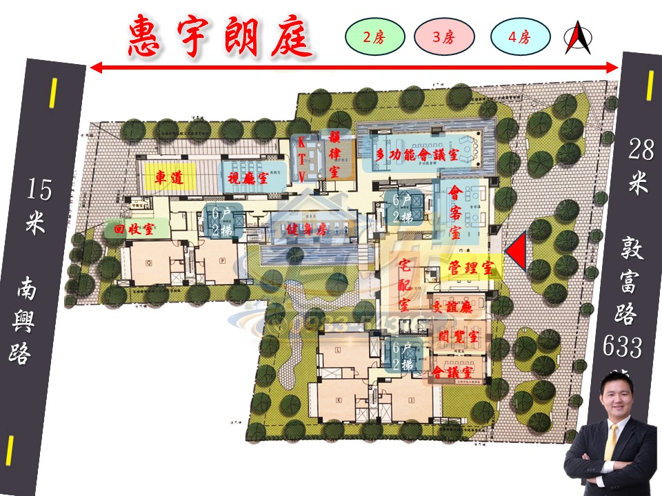 公 設:接待大廳、空中花園、KTV、閱覽室、視聽室、健身房、親子遊戲區、信箱區、曬被區
