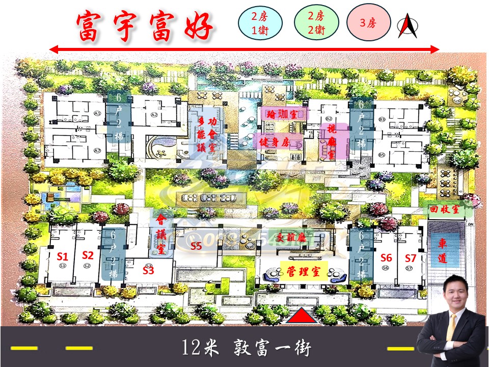 公 設:接待大廳、中庭花園、空中花園、交誼廳、閱覽室、健身房、親子遊戲區、廚藝教室、信箱區、曬被區。