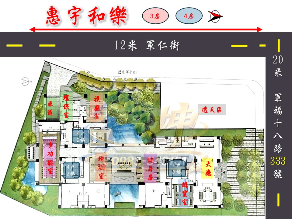公 設:接待大廳、中庭花園、閱覽室、瑜珈教室、健身房、韻律教室、茶屋、視聽室多功能會館