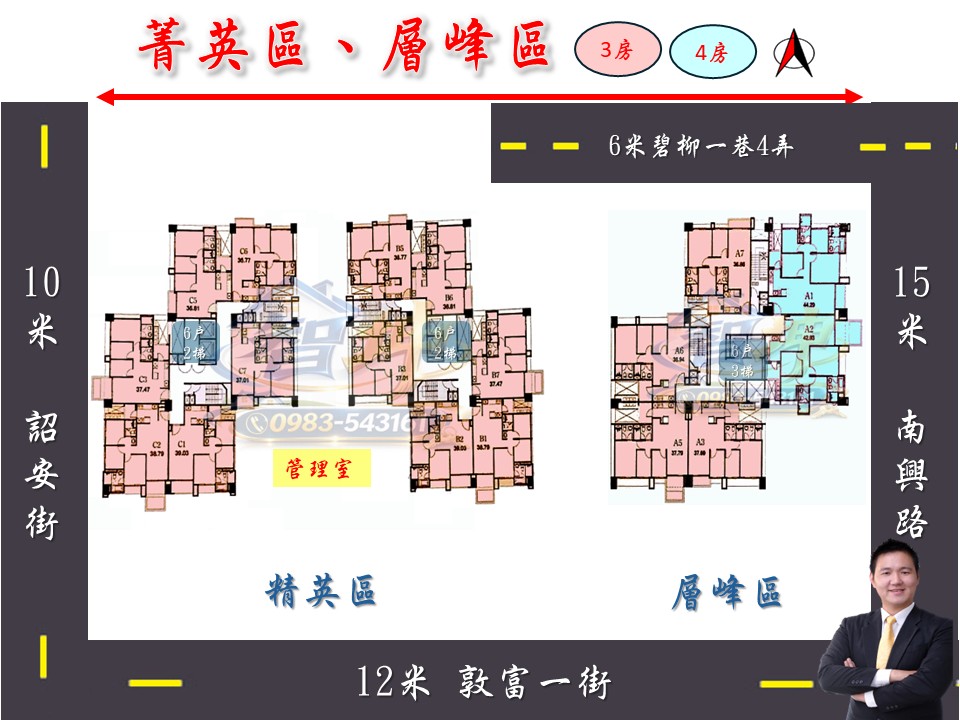電梯戶數:層峰區地上20層,地下4層、精英區地上17樓,地下3樓