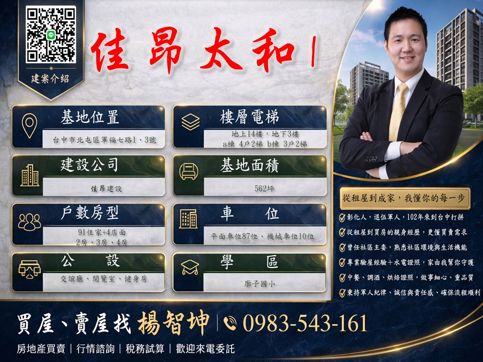 「太和1期」位於台中市北屯區祥順路二段與軍福七路口,由佳昂建設股份有限公司投資興建,基地面積562坪、建蔽率45.12%、公設30~32%,樓層規劃為2棟地上14層,地下3層建築,共有91戶住家,4戶店面,格局坪數規劃二房26坪、三房32~39坪、四房42~54坪。